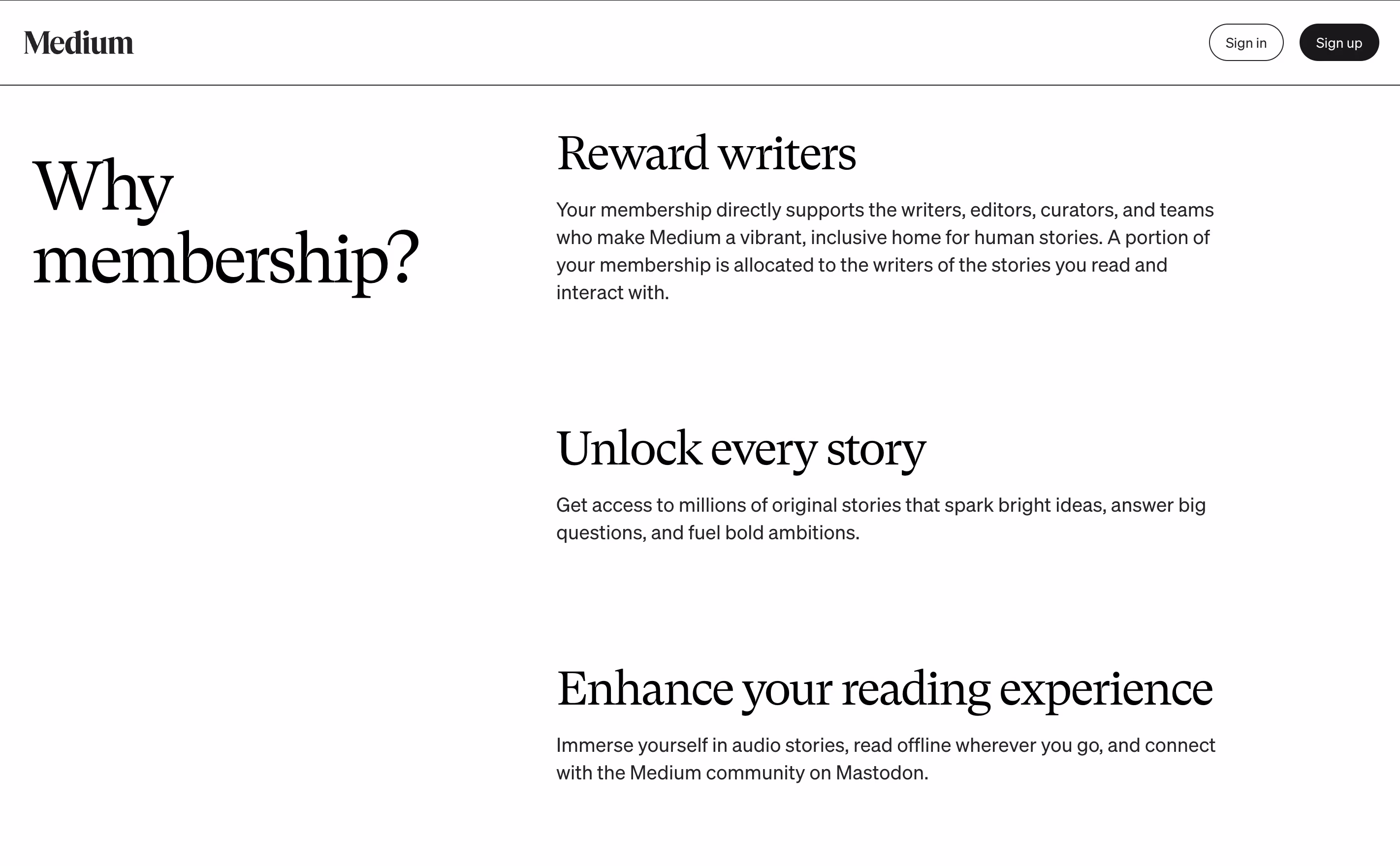 Puedes seguir temas que te gusten, guardar artículos para leer más tarde e interactuar con los escritores a través de comentarios y aplausos (similares a los "me gusta"). Medium ofrece membresías gratuitas y de pago. Los usuarios gratuitos pueden leer un número limitado de historias cada mes, mientras que los miembros de pago tienen acceso ilimitado a todo el contenido.