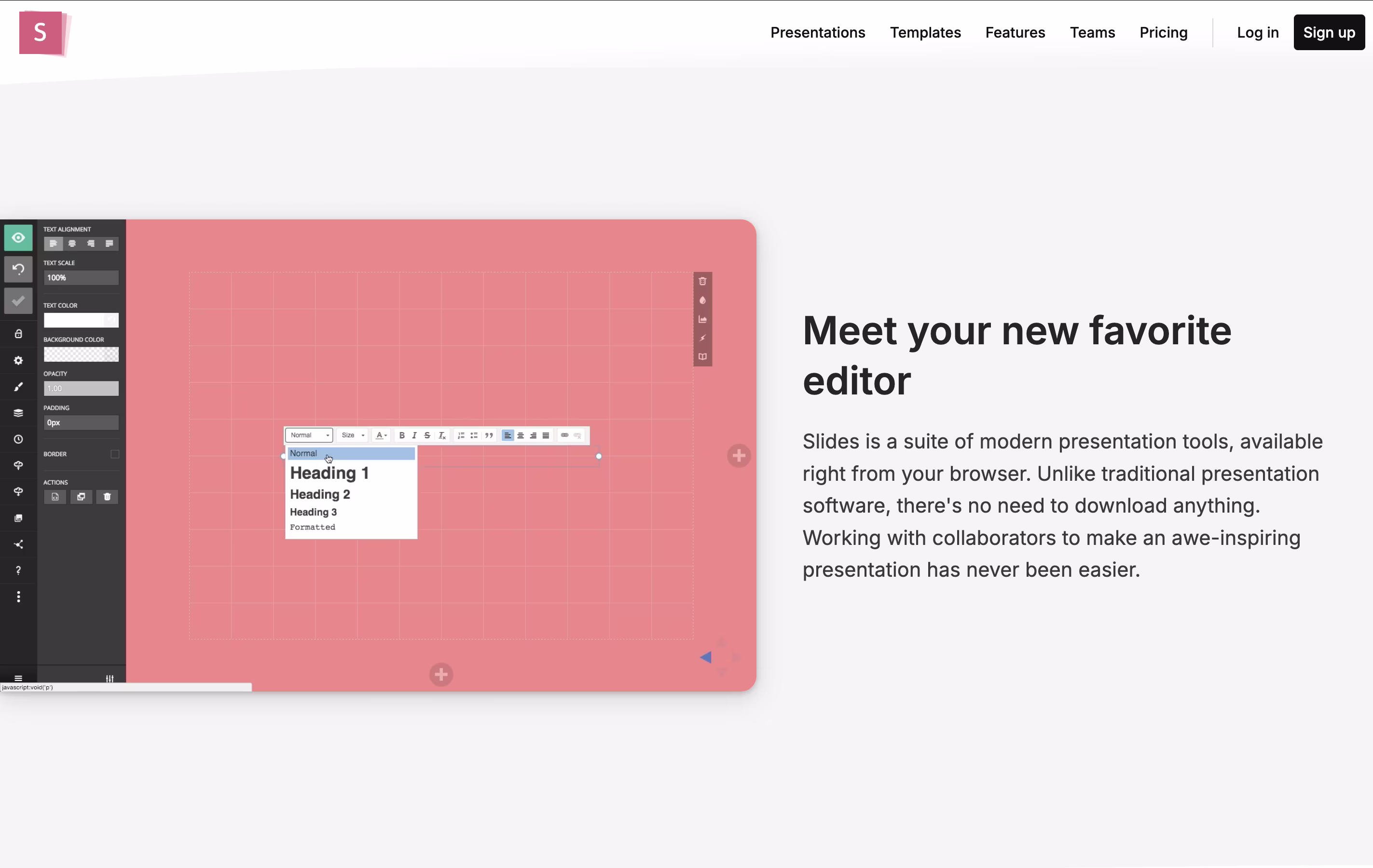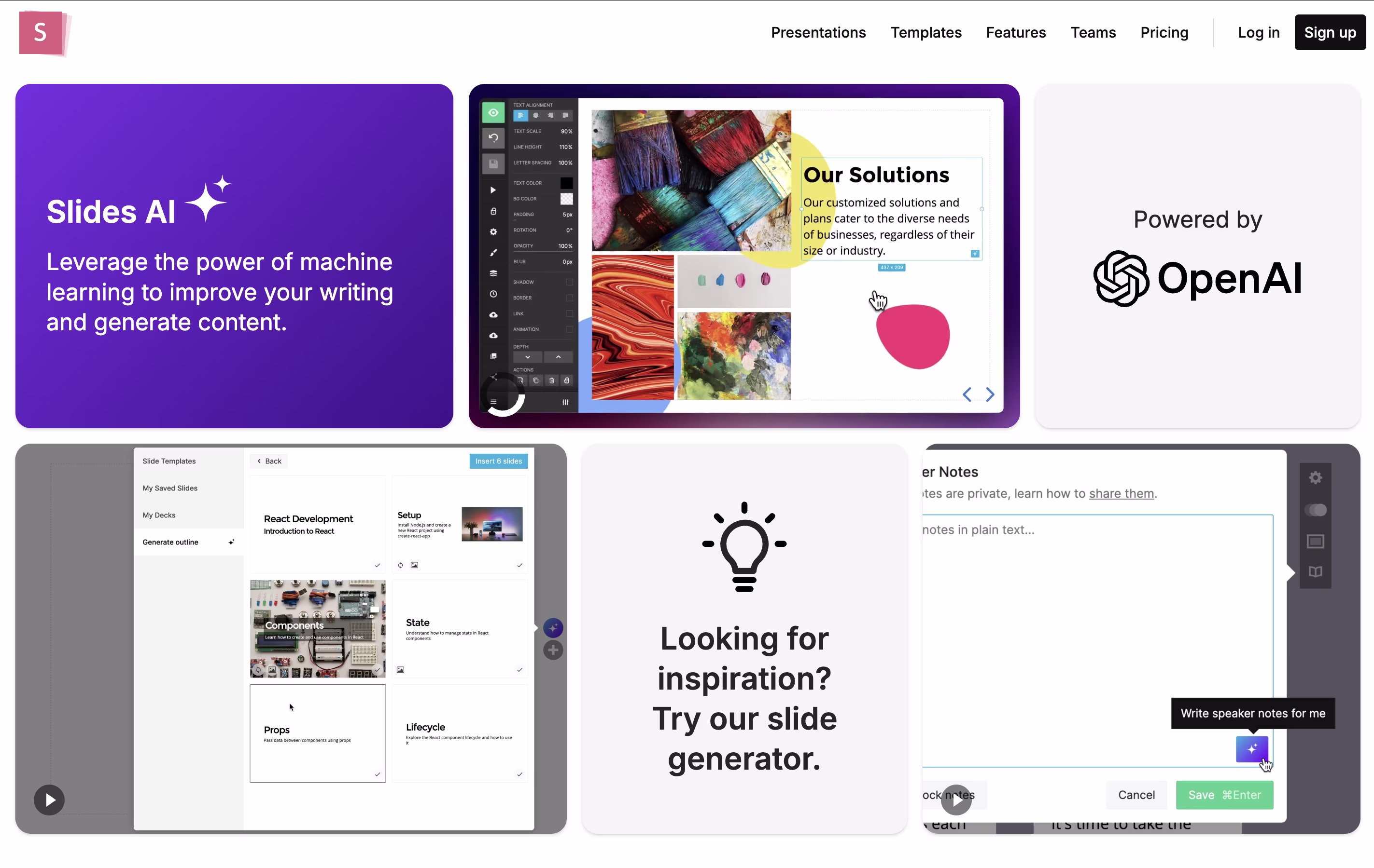 La plateforme offre à la fois des modes d’édition visuelle et d’édition de code. Les utilisateurs peuvent créer des présentations à l’aide d’une interface de glisser-déposer ou écrire du HTML et du CSS personnalisés. Slides prend en charge des fonctionnalités telles que les diapositives imbriquées, les notes du présentateur, la présentation en direct et la collaboration en temps réel. Les présentations peuvent être partagées via des liens simples, intégrées sur des sites web ou exportées pour une utilisation hors ligne. La plateforme est particulièrement populaire auprès des développeurs car elle supporte la coloration syntaxique et permet des démonstrations de code au sein des présentations.