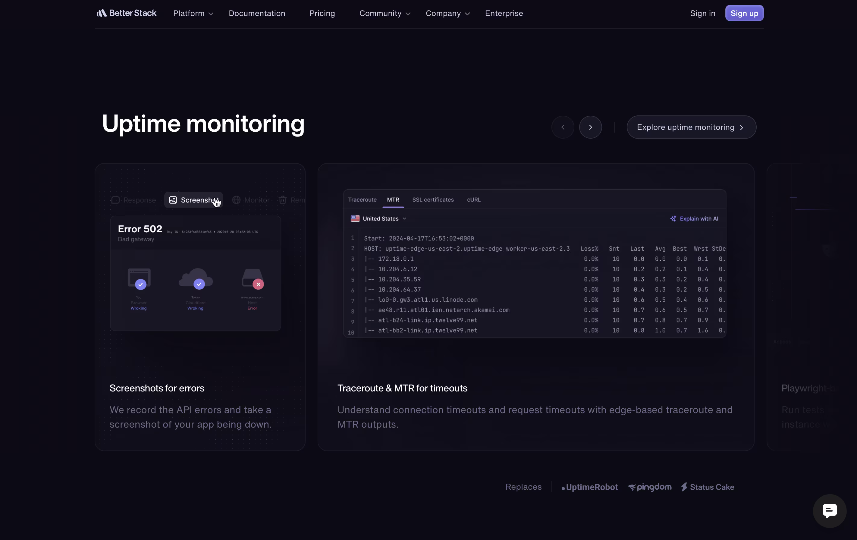 Better Stack is a complete monitoring platform that tracks website uptime, manages incidents, analyzes logs, and provides status pages for teams.