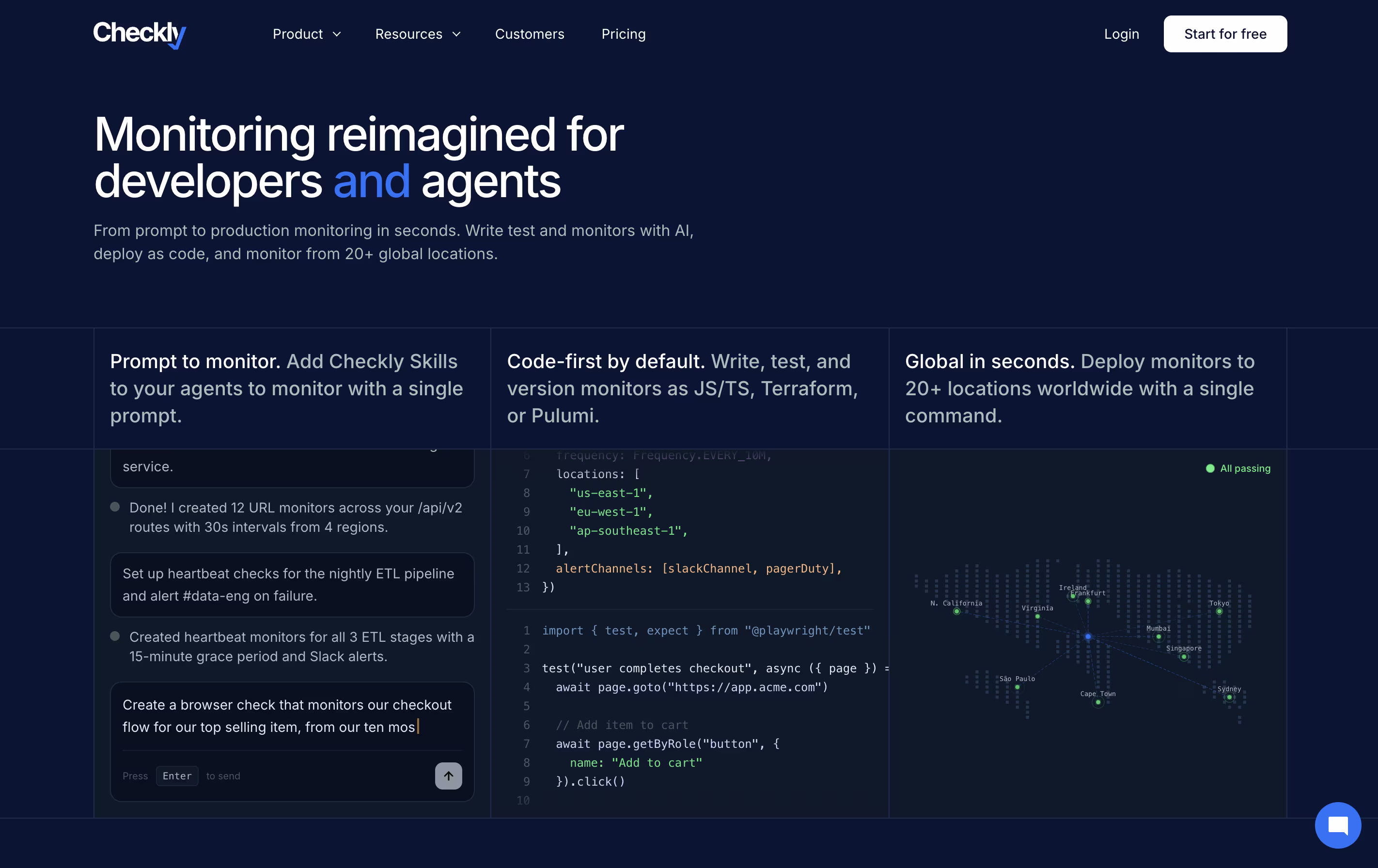 Checkly is a monitoring platform that checks if your websites and apps are working properly. It runs automated tests from different locations around the world to make sure everything functions as expected. Unlike traditional monitoring tools, Checkly lets you write your monitors as code using JavaScript or TypeScript.