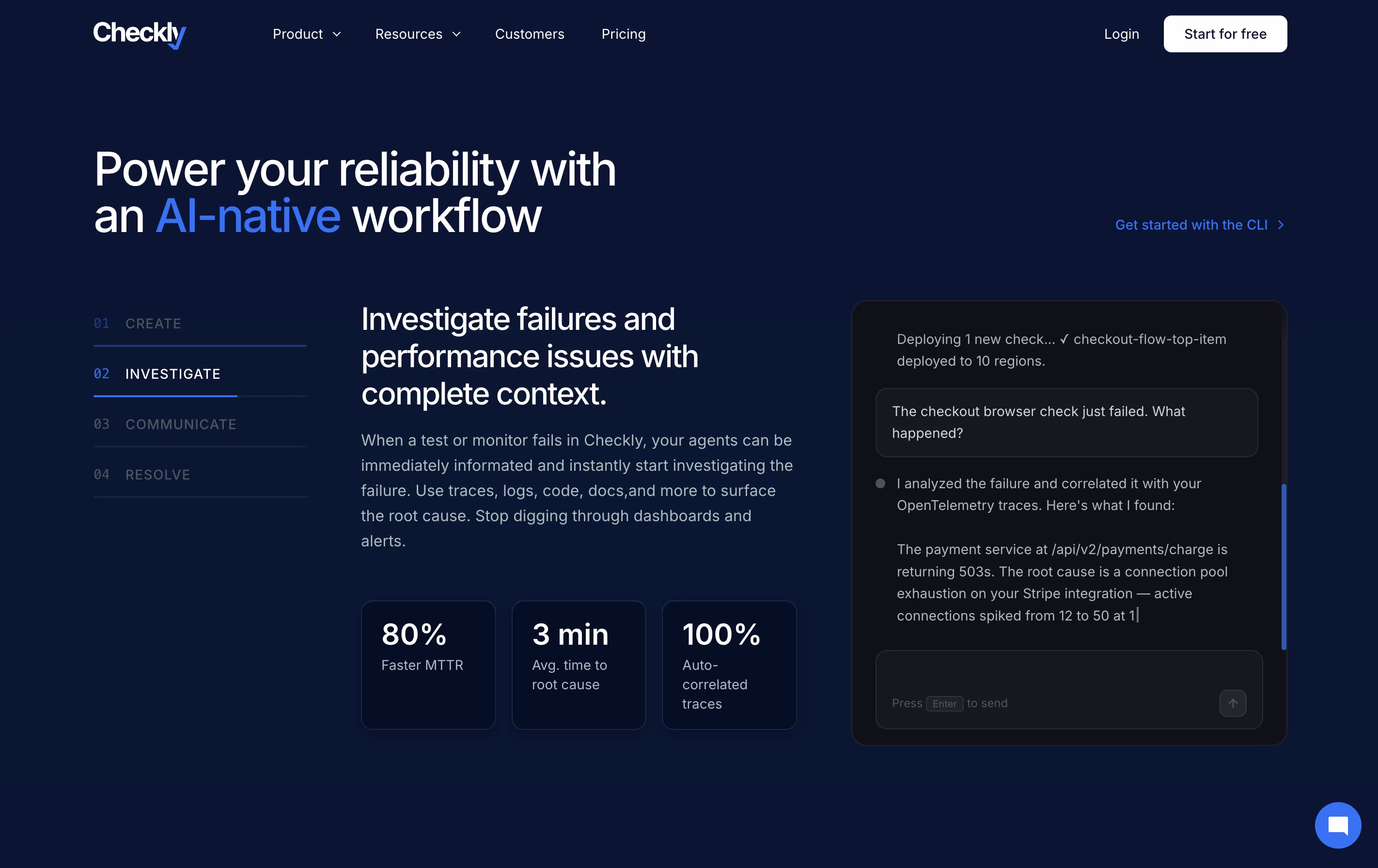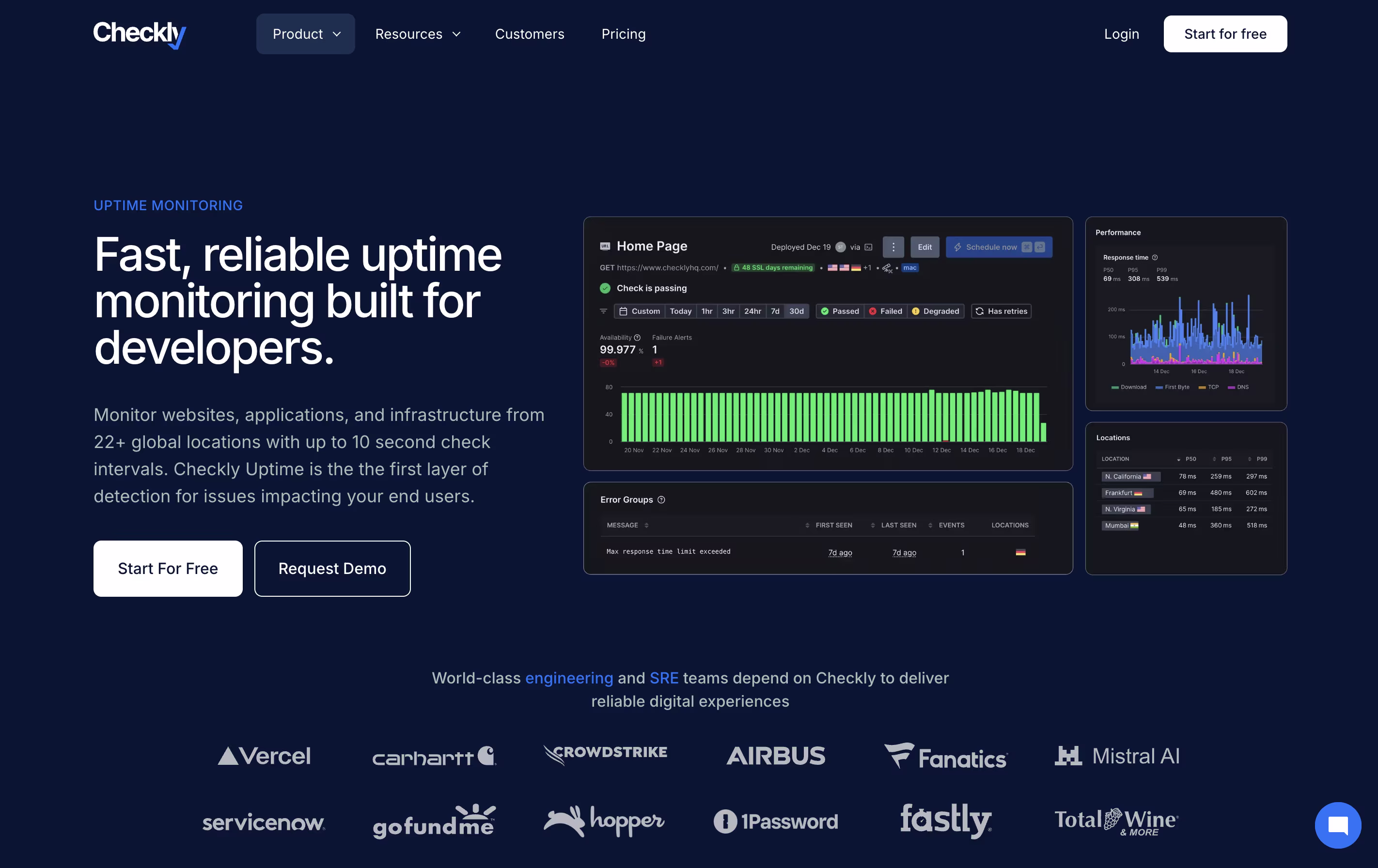 Checkly is a monitoring platform for developers that tests and monitors websites, APIs, and applications using code-based workflows.