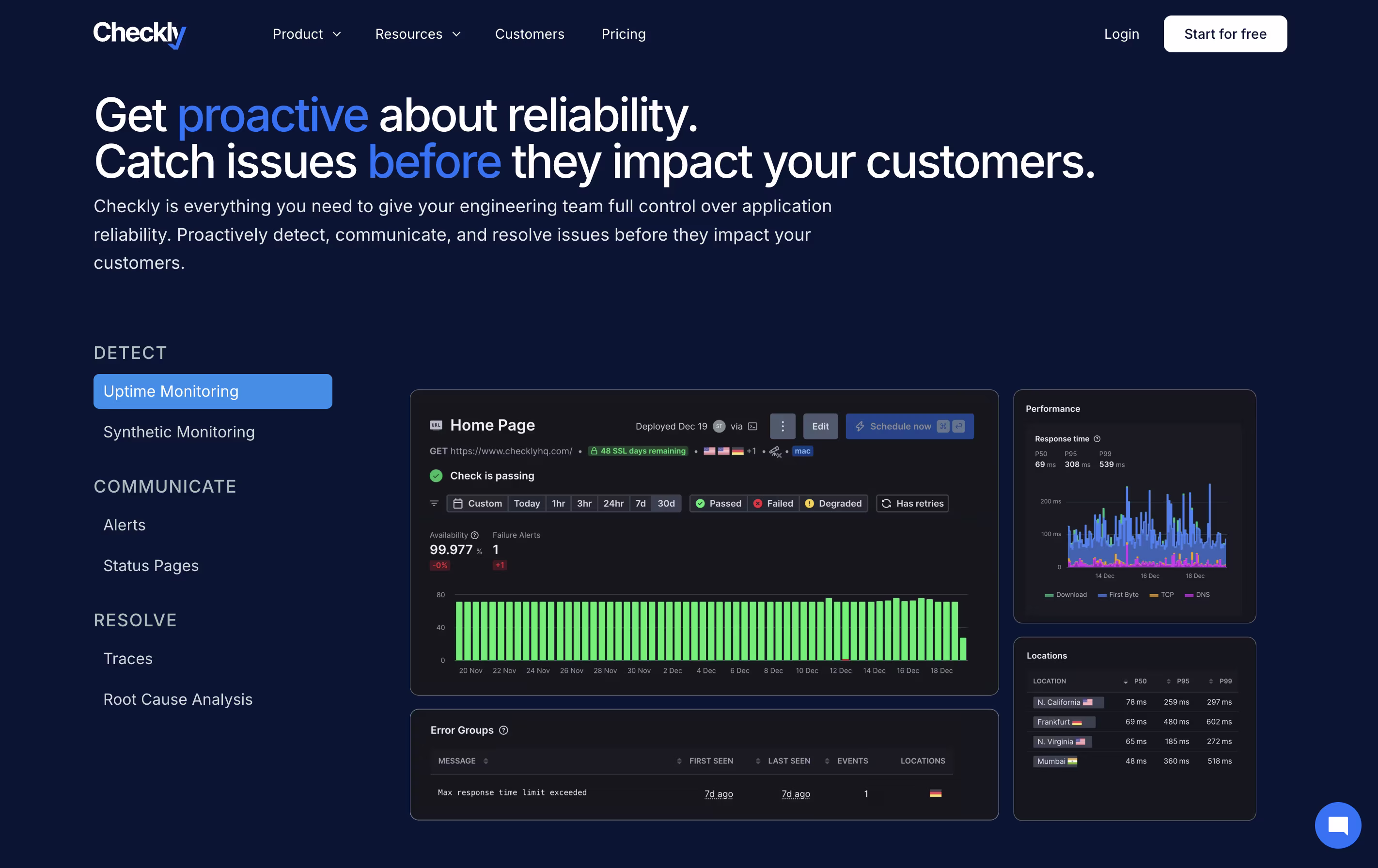 Checkly provides instant alerts when something breaks, showing you exactly what went wrong with screenshots, logs, and traces. It includes built-in status pages to communicate issues to your users and team members automatically.