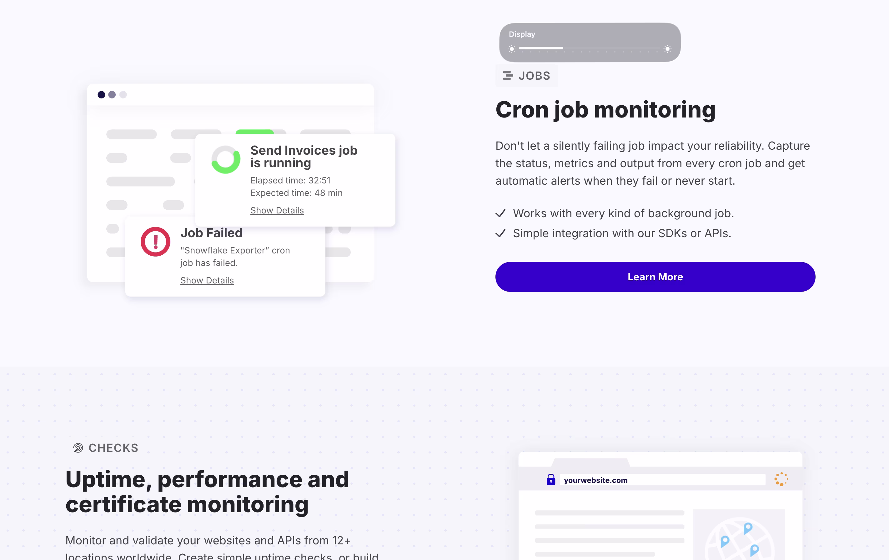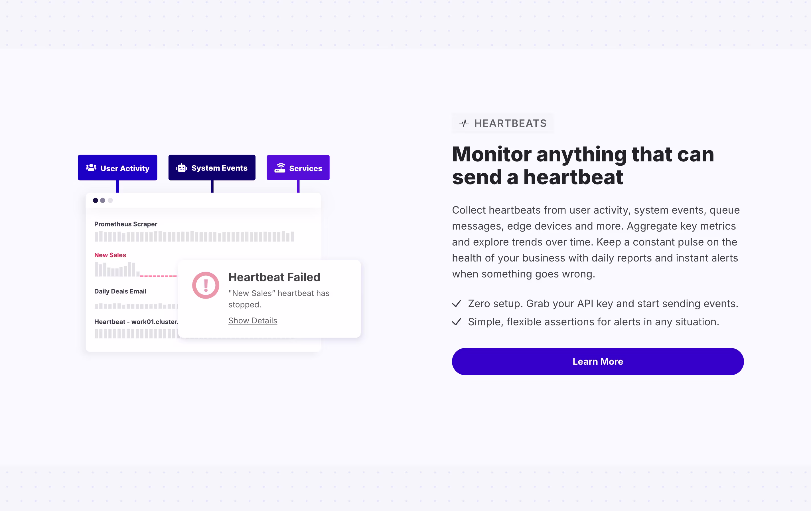 The platform monitors several types of services. It tracks cron jobs and scheduled tasks to ensure they run on time. It watches websites and APIs to check they stay online and respond quickly. It also monitors background processes and heartbeat signals from your systems.