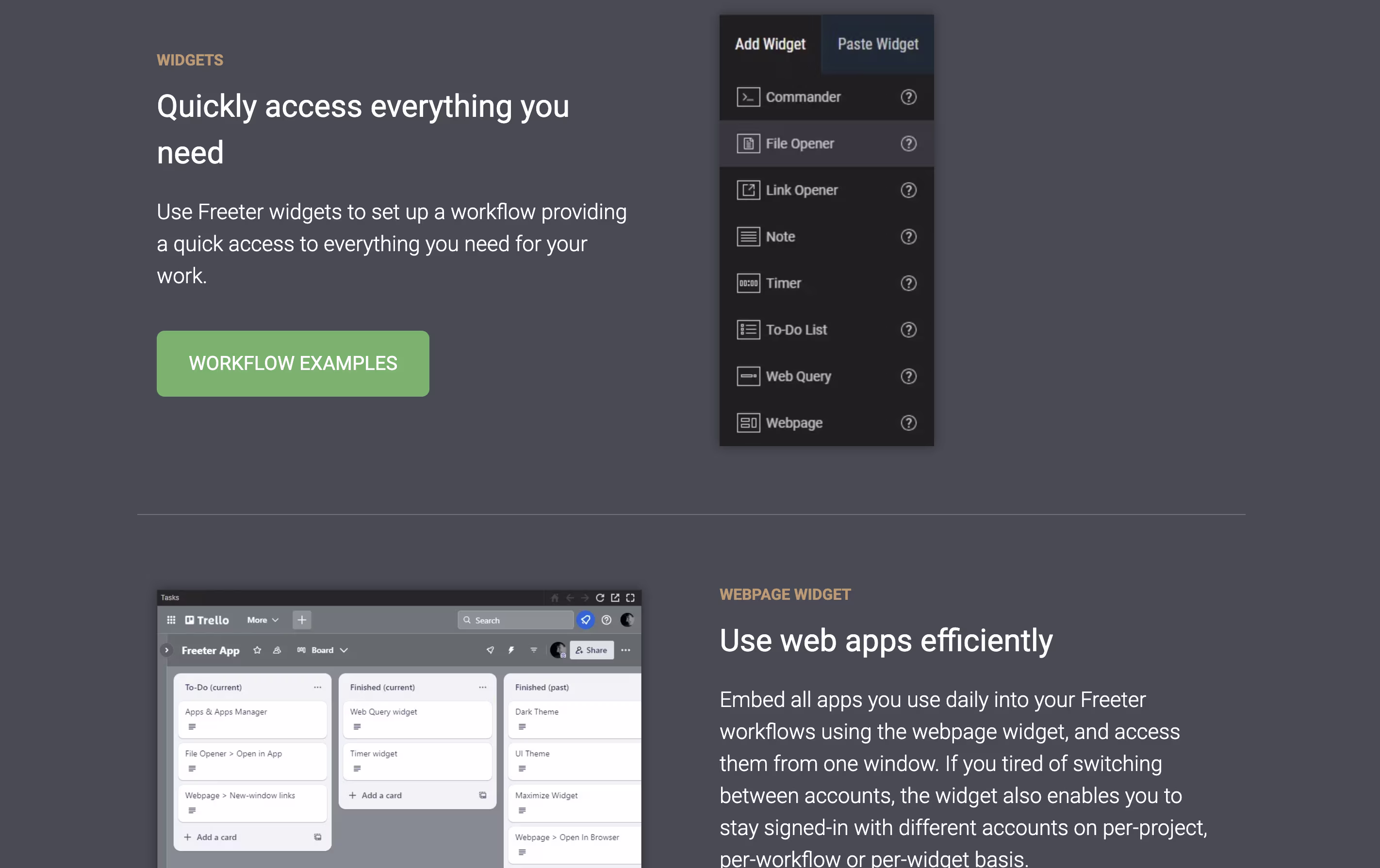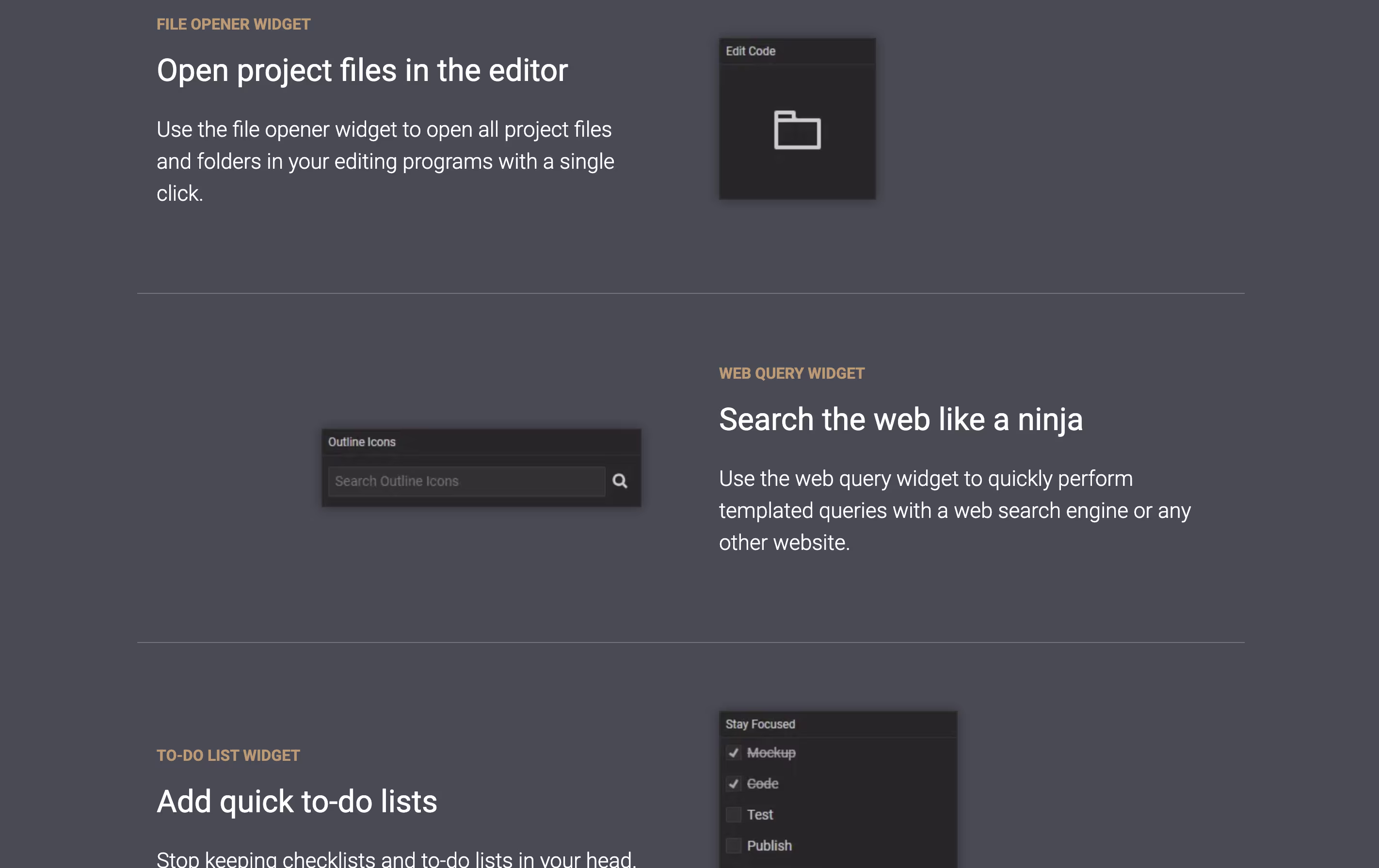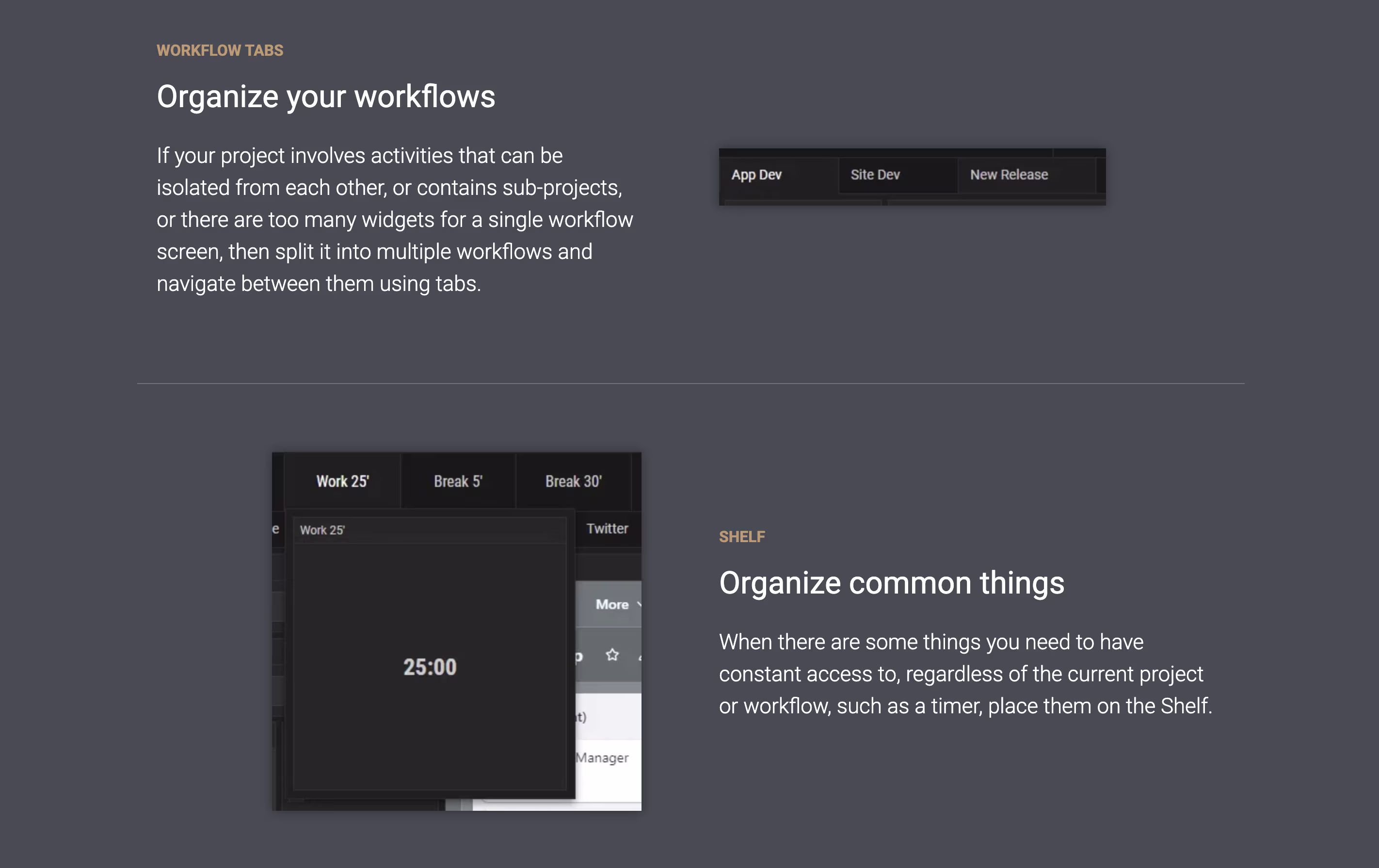 The app uses widgets to bring different tools together. You can embed web apps like Gmail or Trello, open project files with one click, run command-line scripts, keep to-do lists, set timers, and write quick notes. Each project can have multiple workflow tabs to organize different activities.