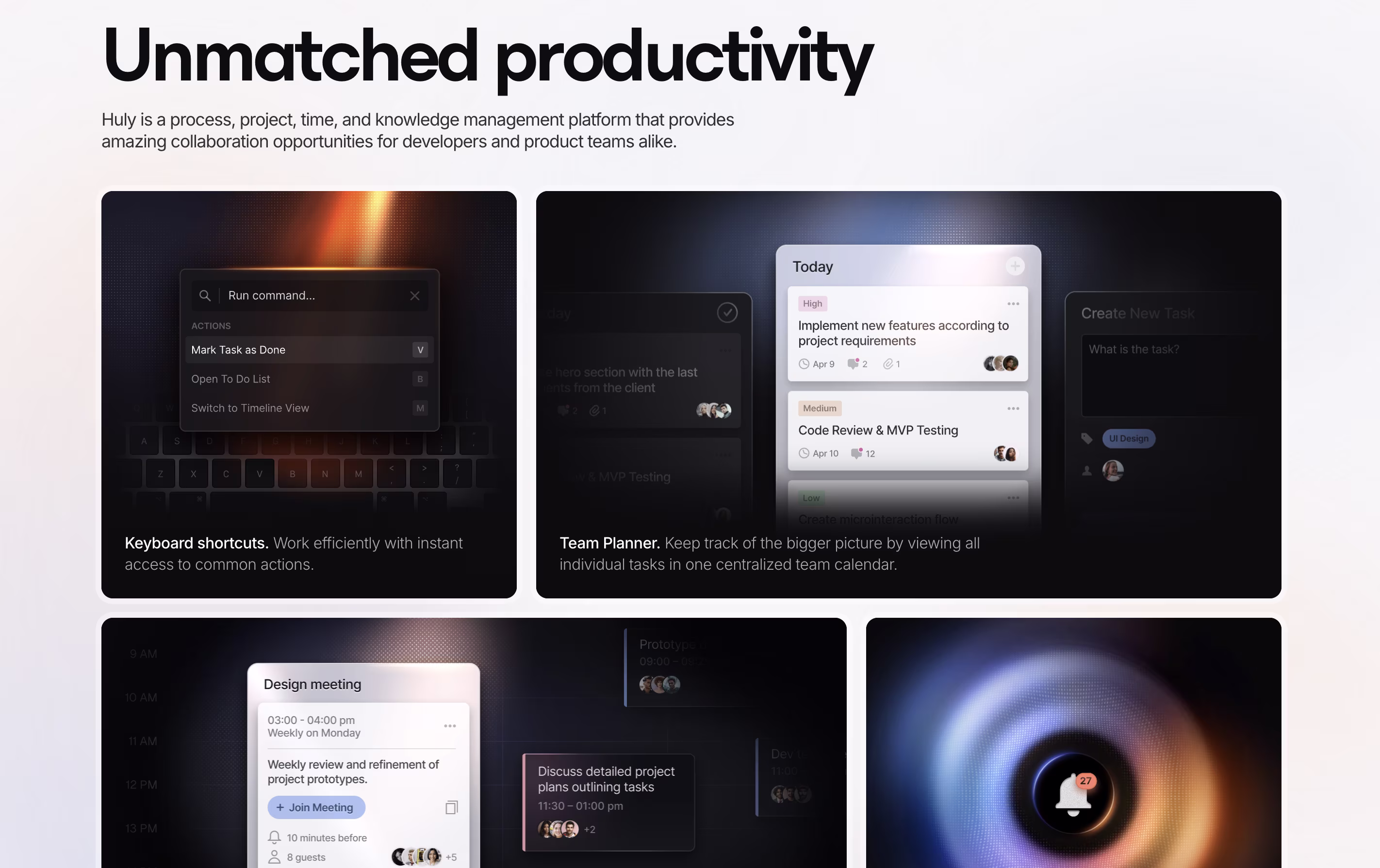 Huly is an all-in-one workspace that combines project tracking, real-time chat, video meetings, and document editing. Unlike traditional tools that focus on one thing, Huly handles multiple team needs together. You can create tasks, chat with teammates, hold video calls, write documents, and plan your schedule without leaving the platform.