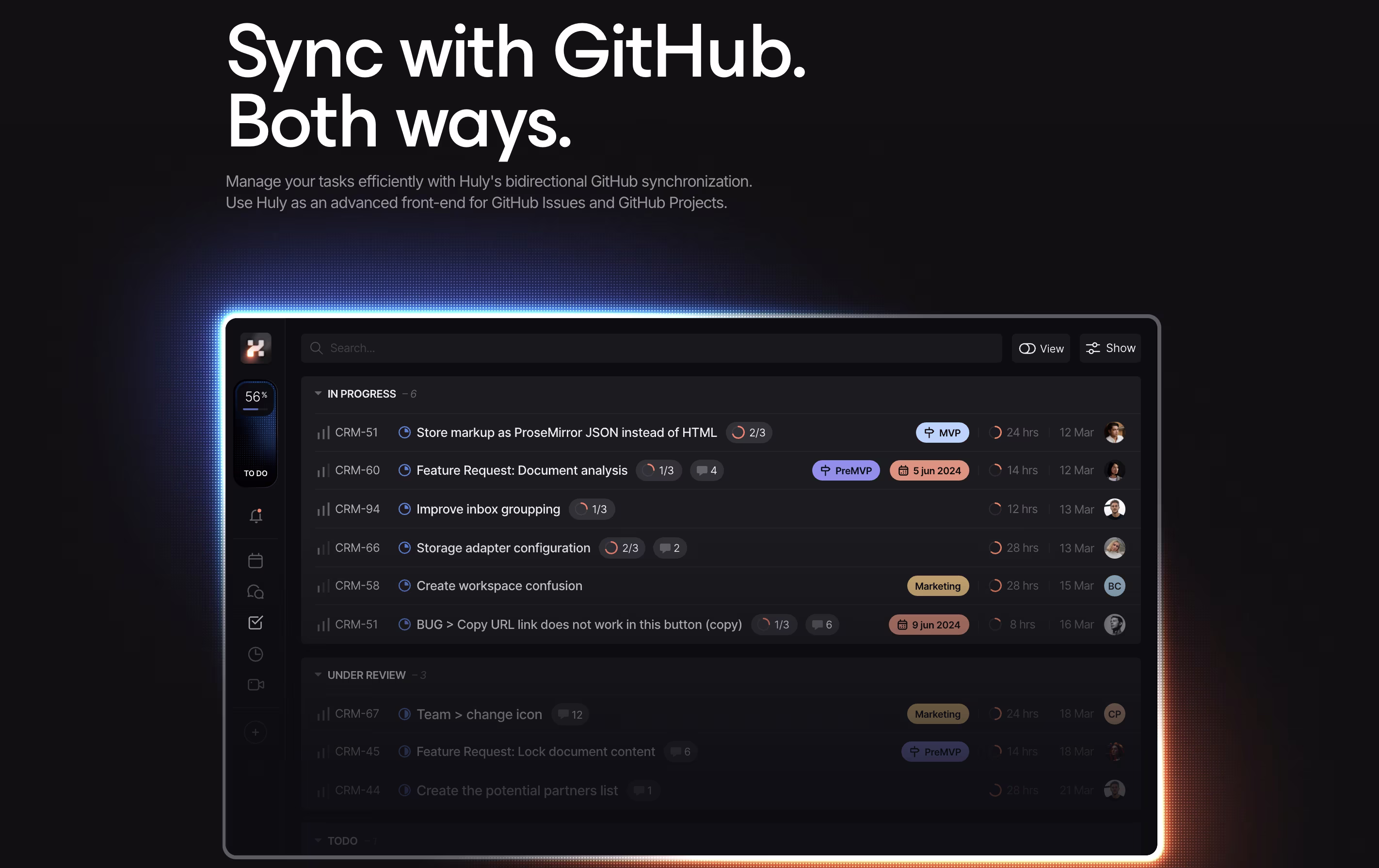 The platform works especially well with GitHub, syncing issues and pull requests automatically. This makes it popular with software development teams. Huly is open-source, meaning the code is publicly available and can be customized. You can use it as a cloud service or host it on your own servers.