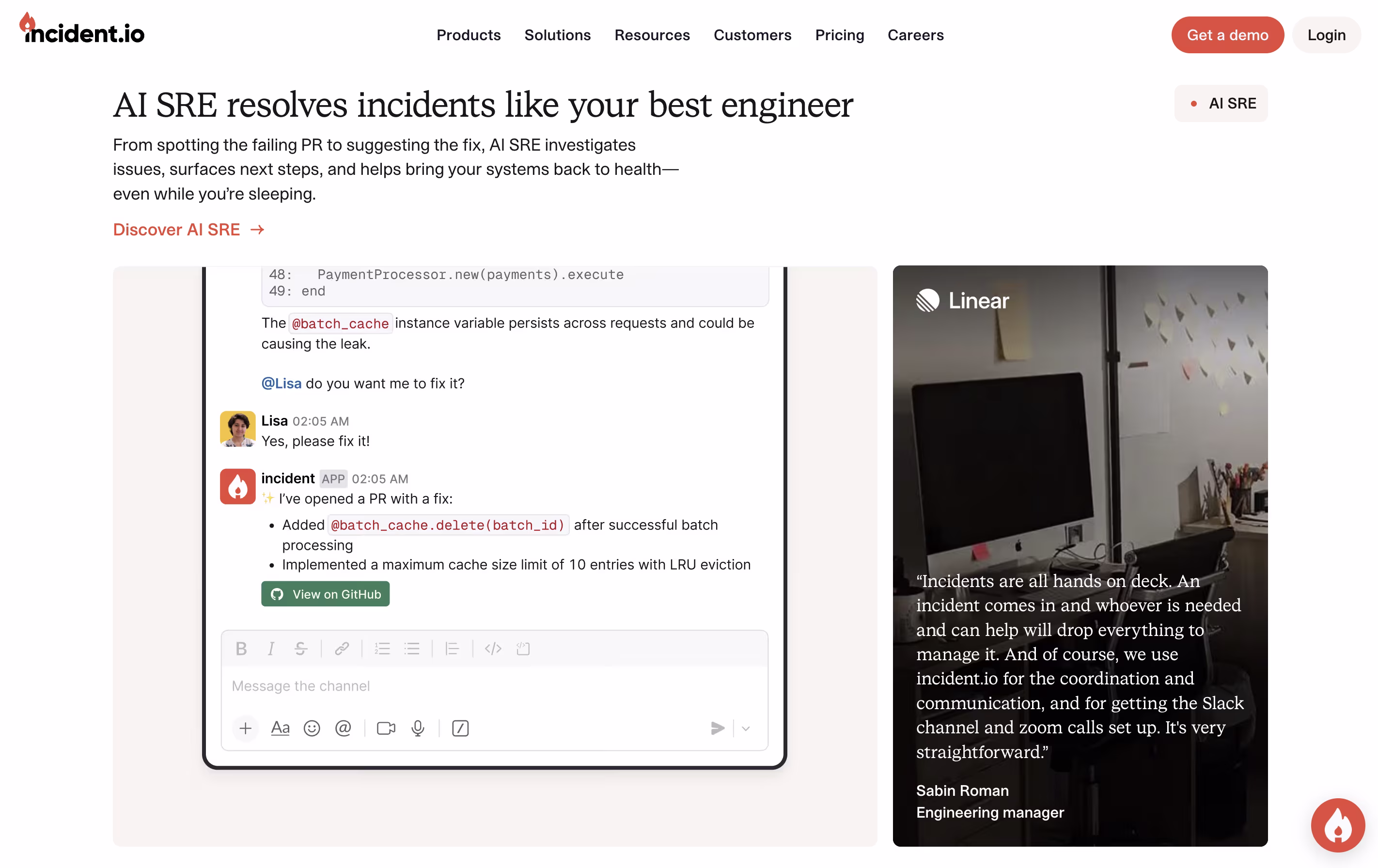 When an incident happens, join the dedicated channel where AI helps investigate, team members coordinate the fix, and everything gets documented automatically.