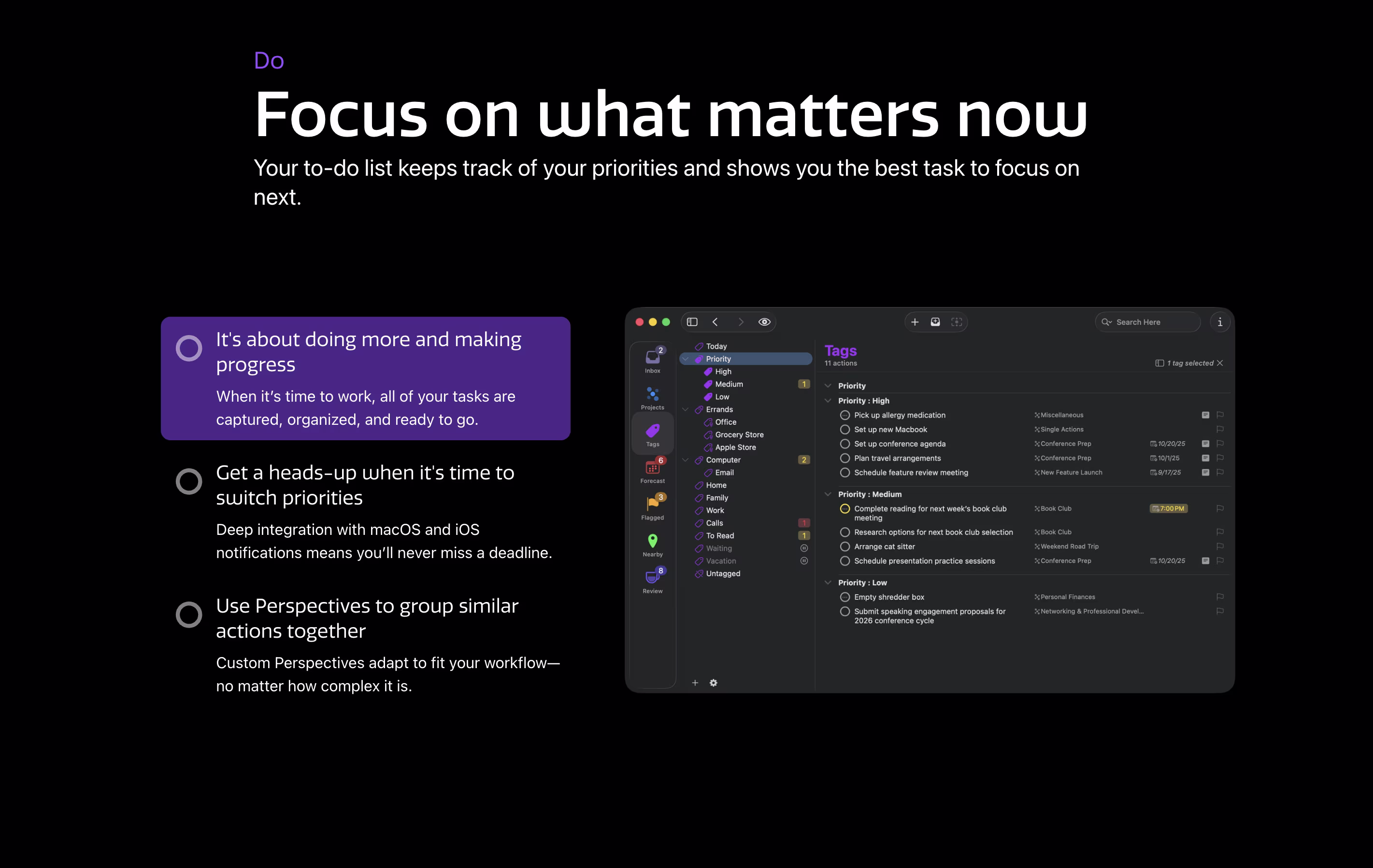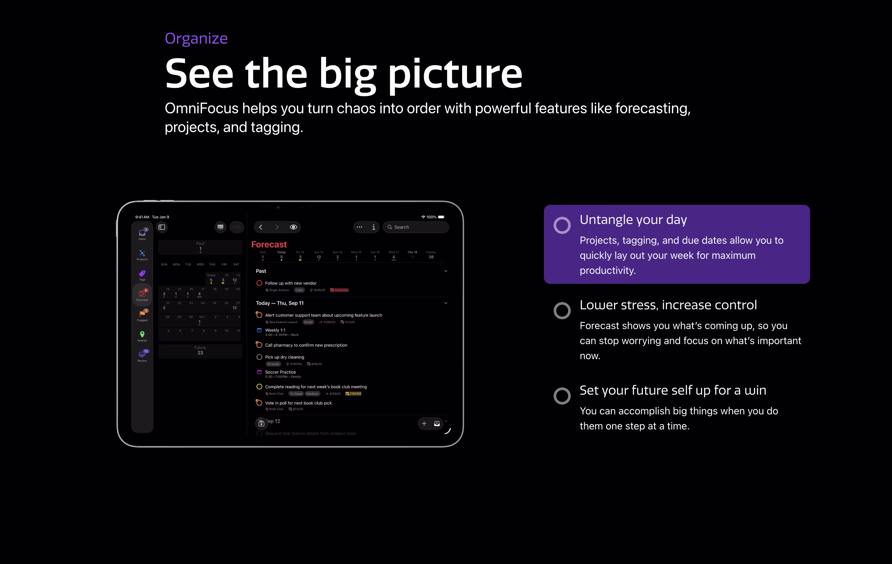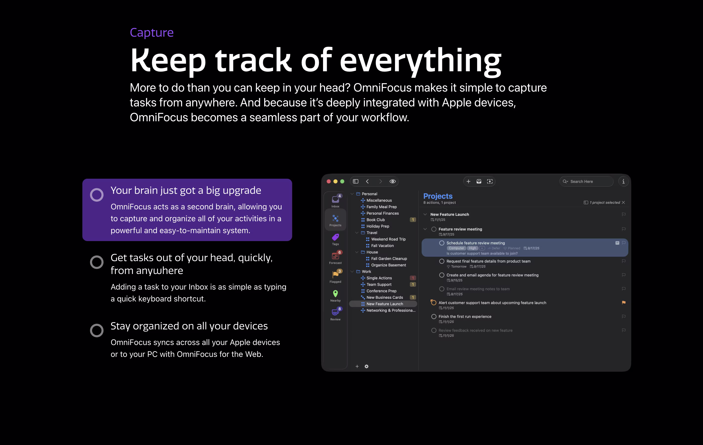 OmniFocus is a task manager that turns chaos into organized action. You can capture any task the moment you think of it, then organize it later with tags, projects, and dates. The tool helps you see what needs attention today while keeping future tasks out of sight until you need them.