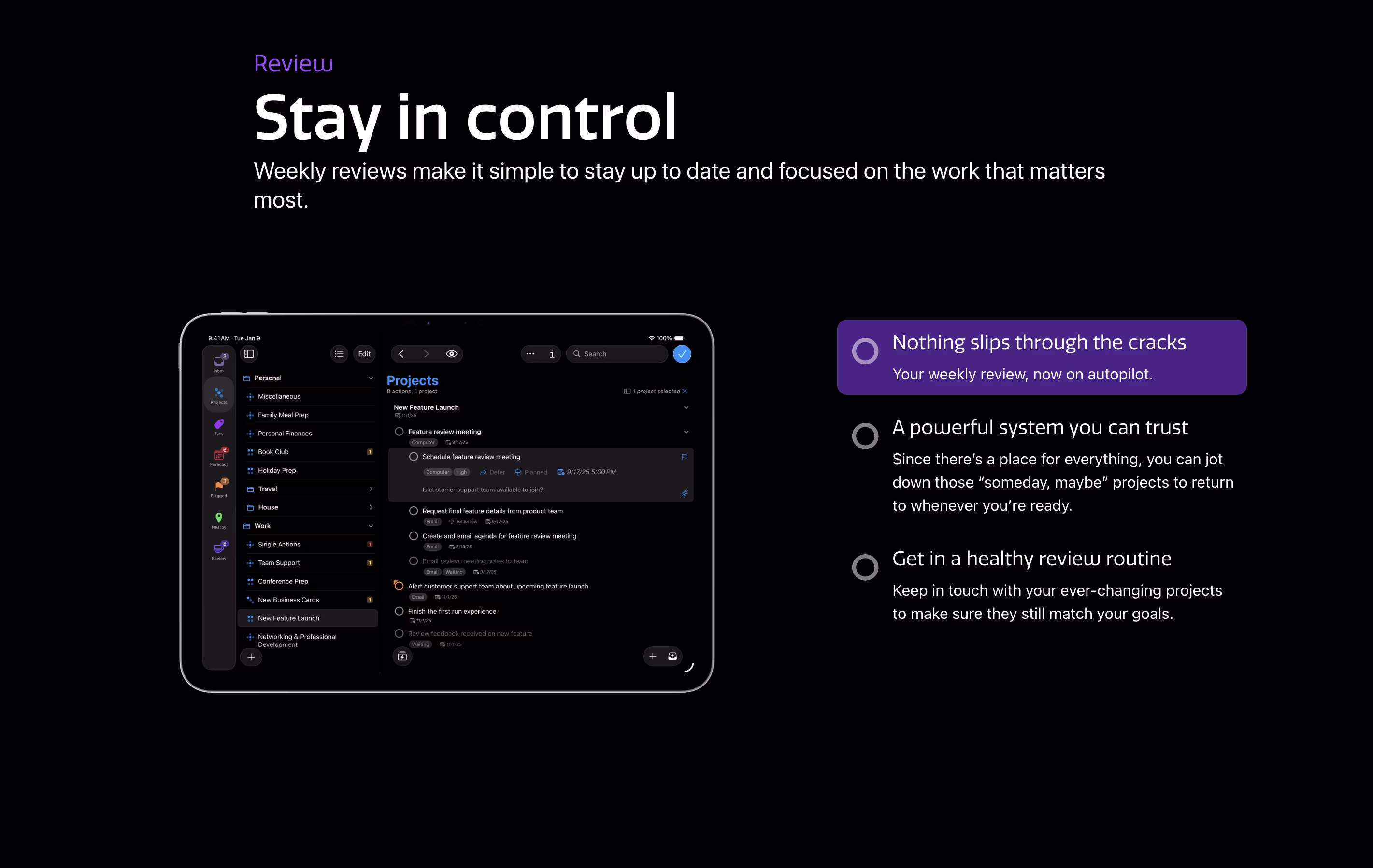 Schedule weekly Reviews to go through each project and make sure everything is current and moving forward. This keeps your system trustworthy and prevents tasks from falling through the cracks.