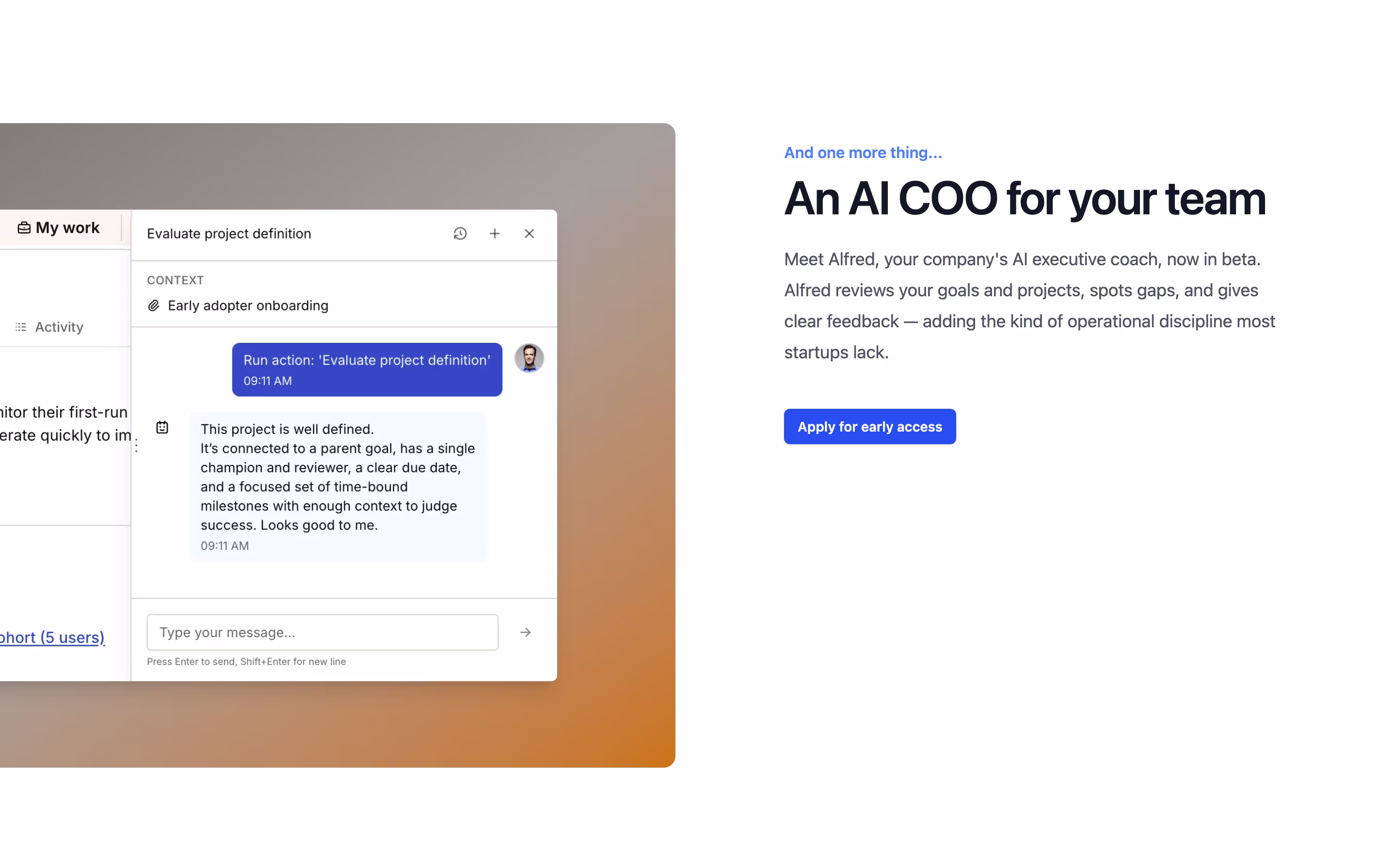 Operately also includes an AI assistant called Alfred that reviews your goals and projects, giving helpful feedback and suggestions to keep your team on track and improve how you work.