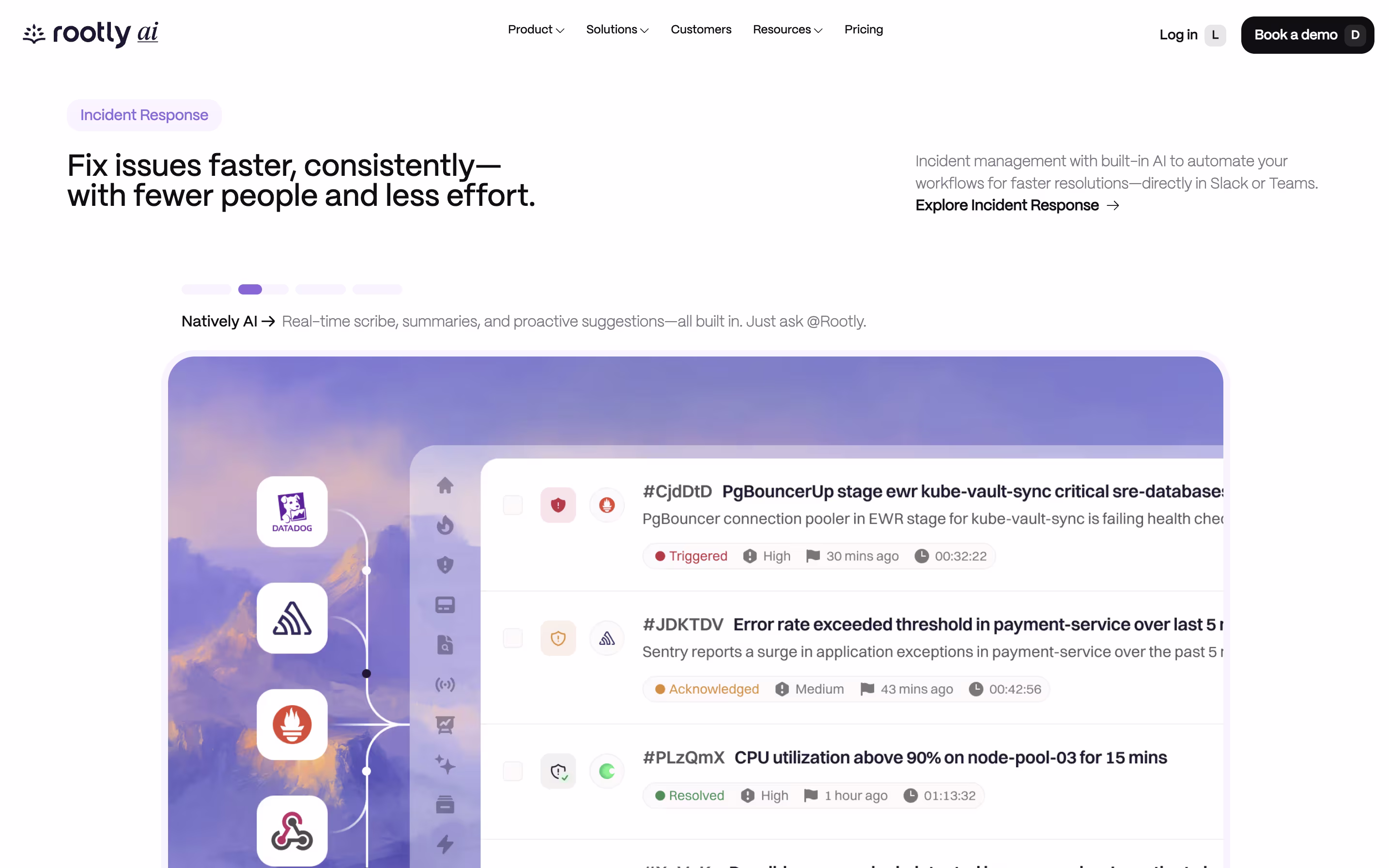 The platform connects with tools you already use, like Jira, PagerDuty, Datadog, and Zoom. Everything happens where your team already works, so you spend less time hunting for information and more time fixing problems.