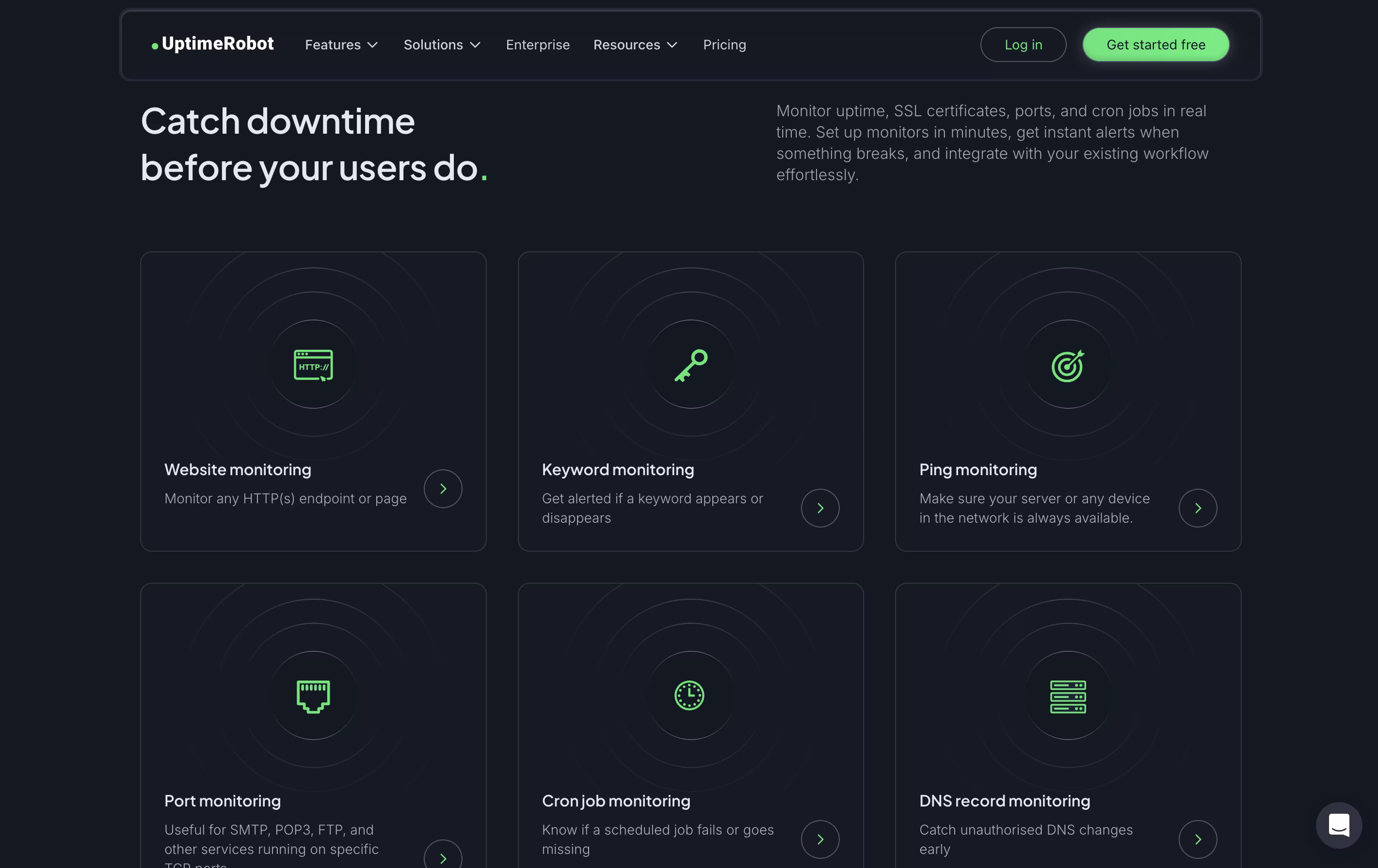 UptimeRobot is a monitoring tool that checks if your website or service is working properly. It sends automated requests to your website at regular intervals and notifies you immediately if it detects any problems. Unlike simple ping tools, UptimeRobot offers different types of checks including website monitoring, port monitoring, keyword tracking, and scheduled task verification.